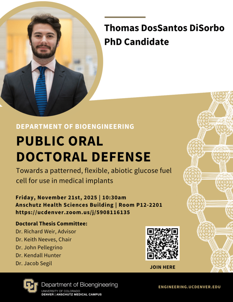 DiSorbo, T., Pellegrino, J., Weir, R.F.ff., (2023): Towards an Implantable Abiotic Glucose Consuming Fuel Cell for Medical Devices. Rocky Mountain American Society of Biomechanics April Conference: Podium Presentation, 4/8/2023
