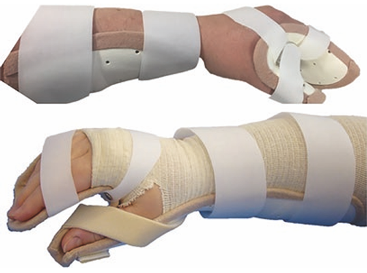 After surgical reconstruction, orthoses are the next treatment for complete BPIs. Existing orthoses have limited functional outcomes for prehension for multiple reasons. Most common orthoses are designed to support the limb without assisting in function.4 Examples of orthoses such as this include the Wilmer Carrying Orthosis and the intrinsic plus resting hand orthosis, which can be seen below in Figures 3 and 4.