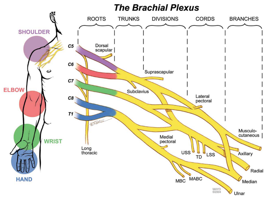 The brachial plexus is the most complex structure in the peripheral nervous system (PNS), and it controls all parts of the upper extremity.1 It is a network of nerves that start in a series of spinal vertebrae. The brachial plexus has roots in the cervical vertebra 5 through the thoracic vertebra 1, denoted as C5, C6, C7, C8, T1.2 A visualization of this anatomy as well as the parts of the upper extremity each nerve root controls can be seen below in Figure 1.